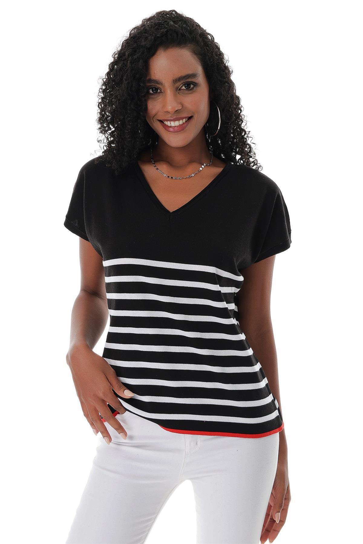 Chuba Kadın V Yaka Çizgili Geniş Kalıp Marin Kısa Kollu İnce Triko T-Shirt Siyah-Beyaz 23S1009