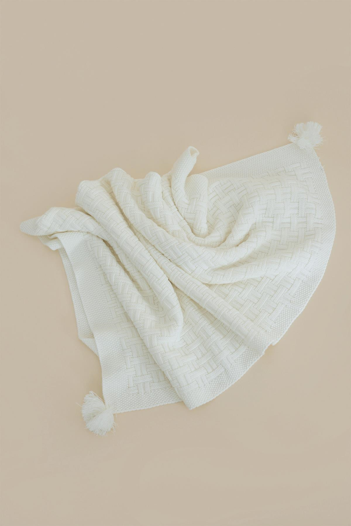 Chuba Çocuk Hasır Desenli Ponponlu Triko Battaniye (80cmx100cm) Ekru CHKIDS203