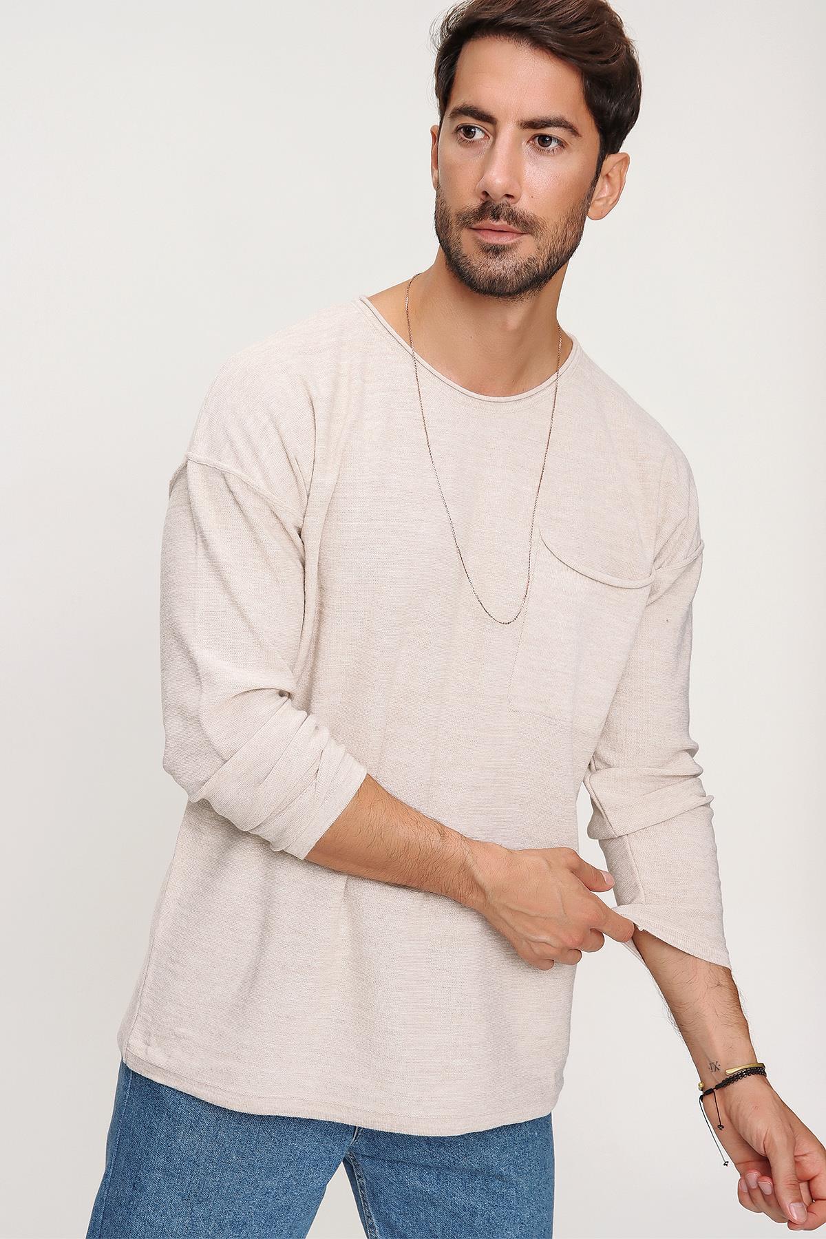 Chuba Erkek Bej Hero Bisiklet Yaka Pis Dikiş Cepli Uzun Kol İnce Triko Kazak 22W202
