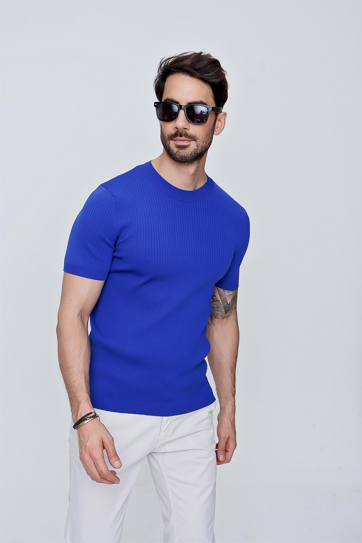 Chuba Erkek Bisiklet Yaka Fitilli Kısa Kol İnce Triko Kazak Saks 22SM201