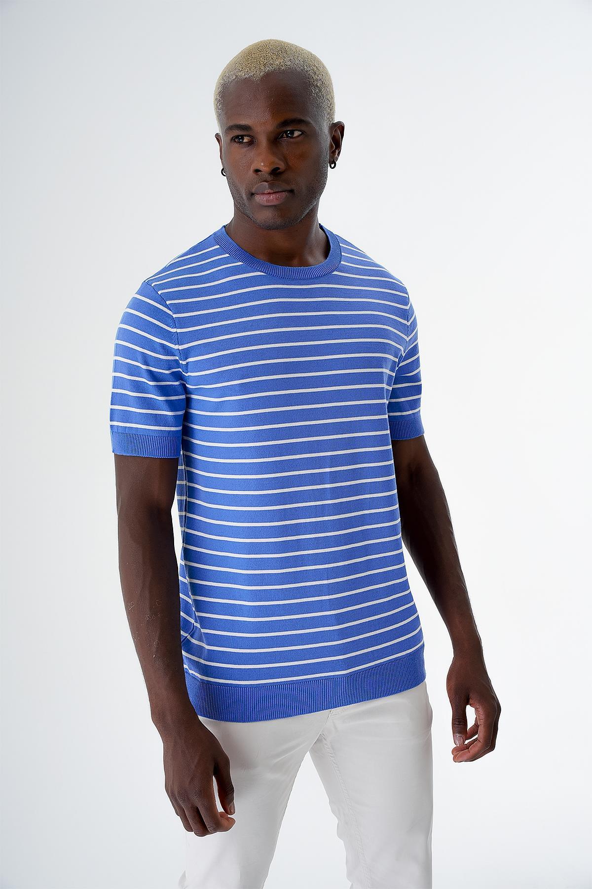 Chuba Erkek Bisiklet Yaka Standart Fit Çizgili Kısa Kollu Triko Kazak İndigo-Beyaz 24S262