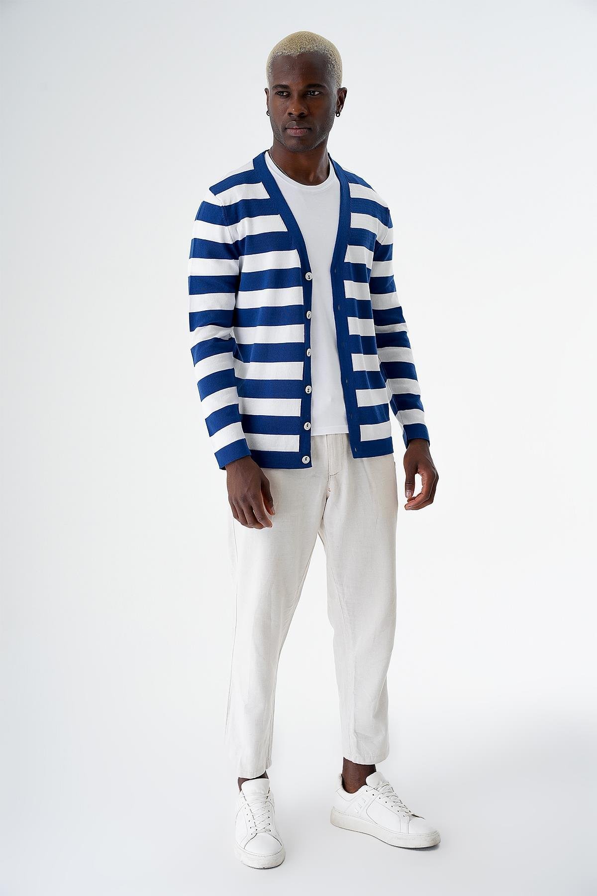 • Enine çizgili, V form, önde düğme kapamalı, uzun kollu Chuba erkek hırka.