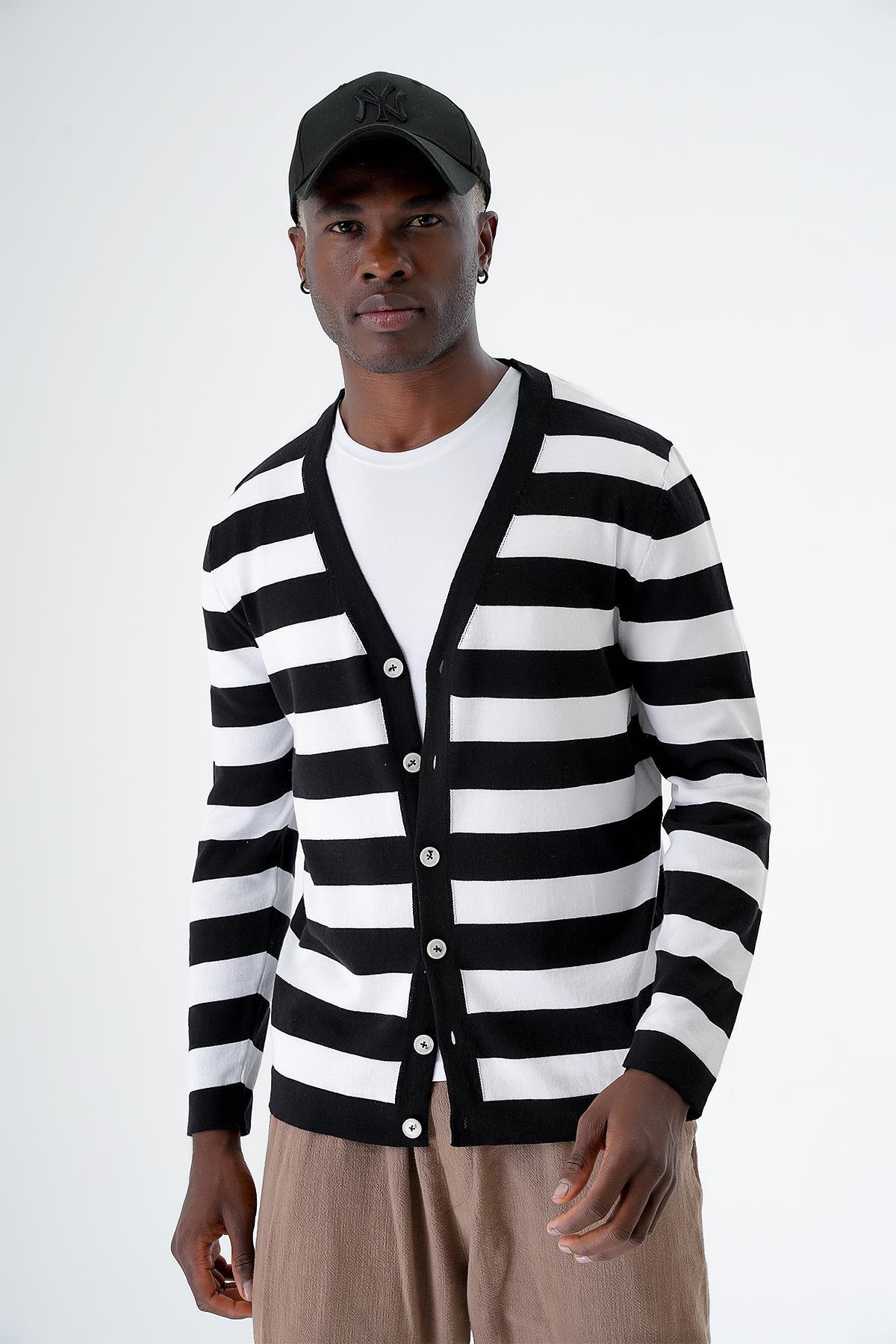 Chuba Erkek Çizgi Bloklu Düğmeli Standart Fit Pamuklu Triko Hırka Siyah-Beyaz 24S273