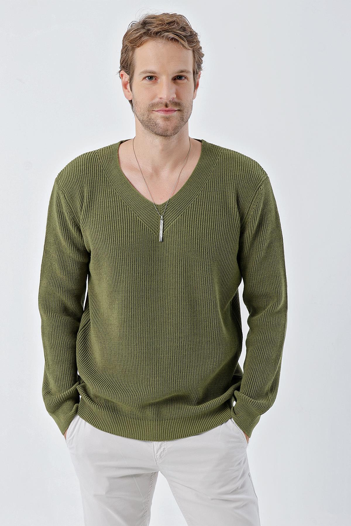 Chuba Erkek Genova V Yaka Standart Fit Triko Kazak Haki 24W209