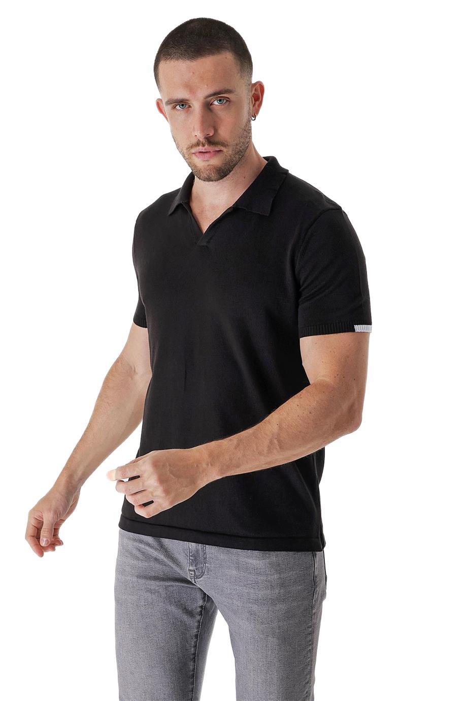 Chuba Erkek Polo Yaka Kontrast Çizgi Detaylı Pamuklu İnce Triko T-Shirt Siyah  22SM209