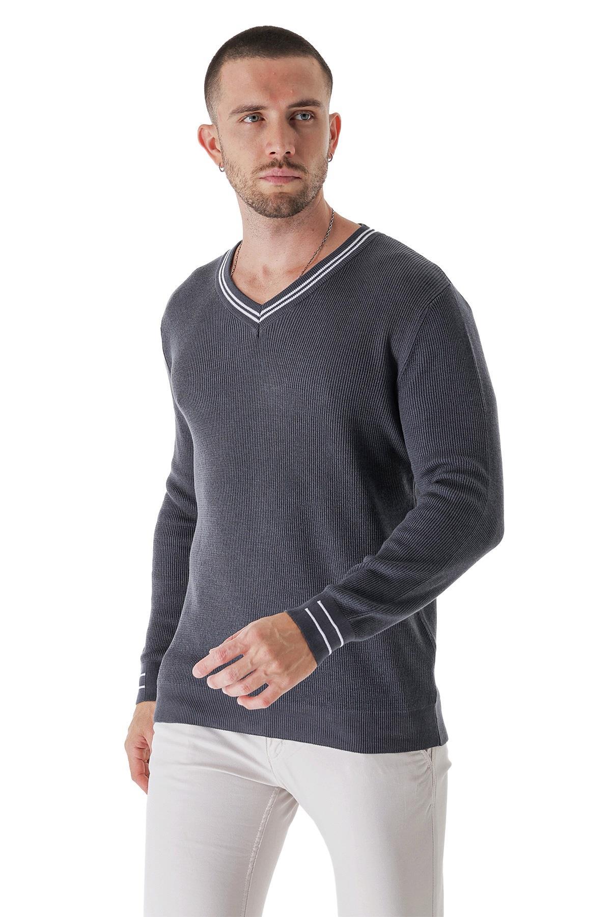 Chuba Erkek V Yaka Çizgi Detaylı Selanik Triko Kazak Antrasit 23S2002
