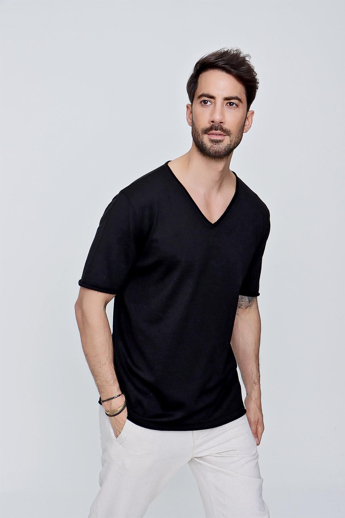• V Yaka Pamuklu İnce Triko T-Shirt.