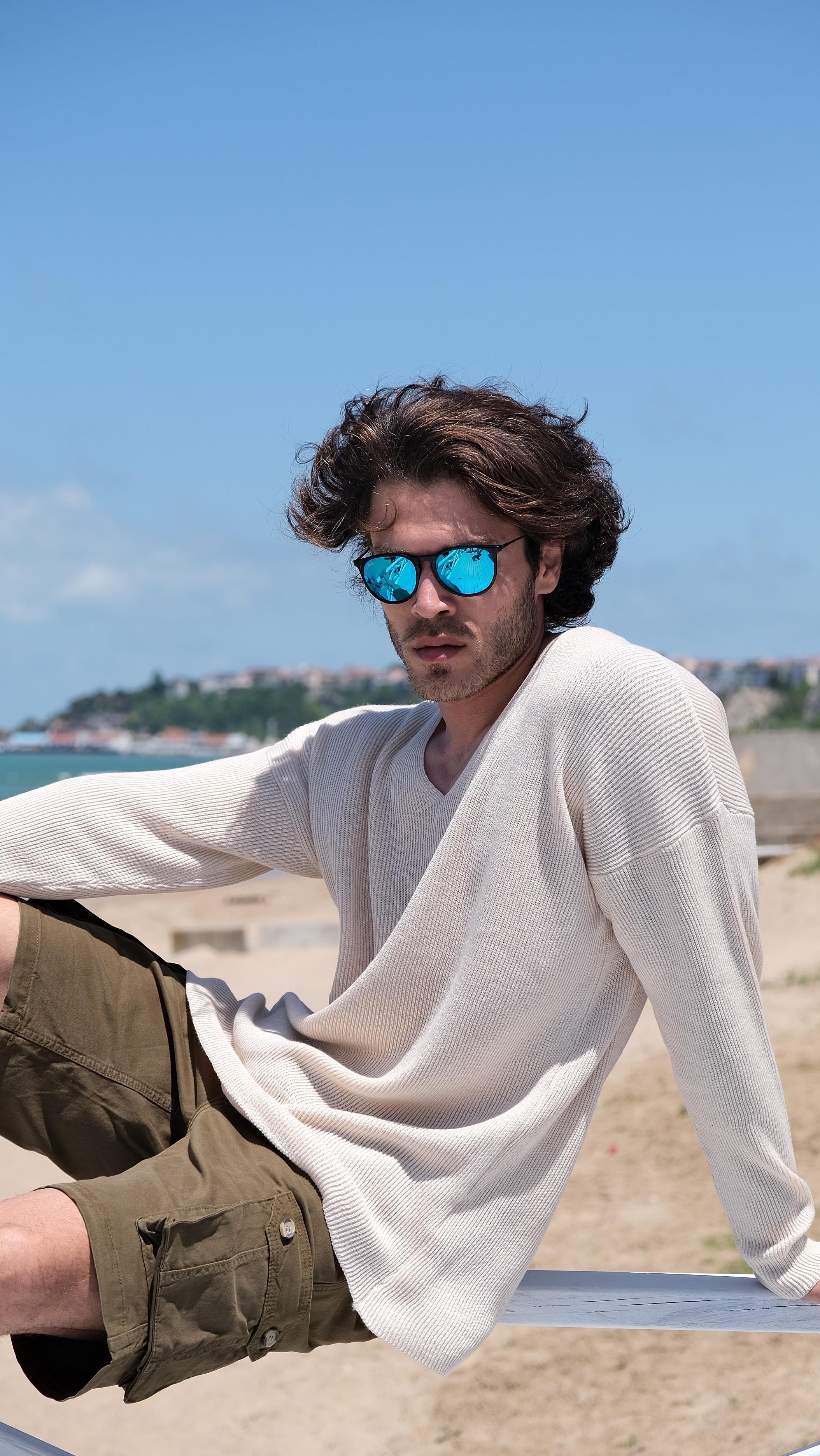 • V Yaka, Selanik Örgü, Pamuklu Mevsimlik Triko Kazak.