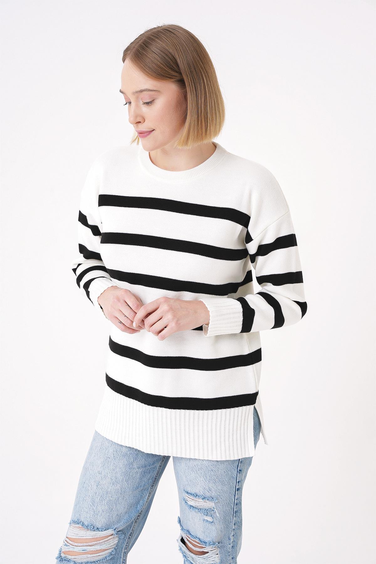 Chuba Kadın Bisiklet Yaka Dokulu Rahat Kalıp Çizgili Triko Kazak Beyaz-Siyah 25W3002