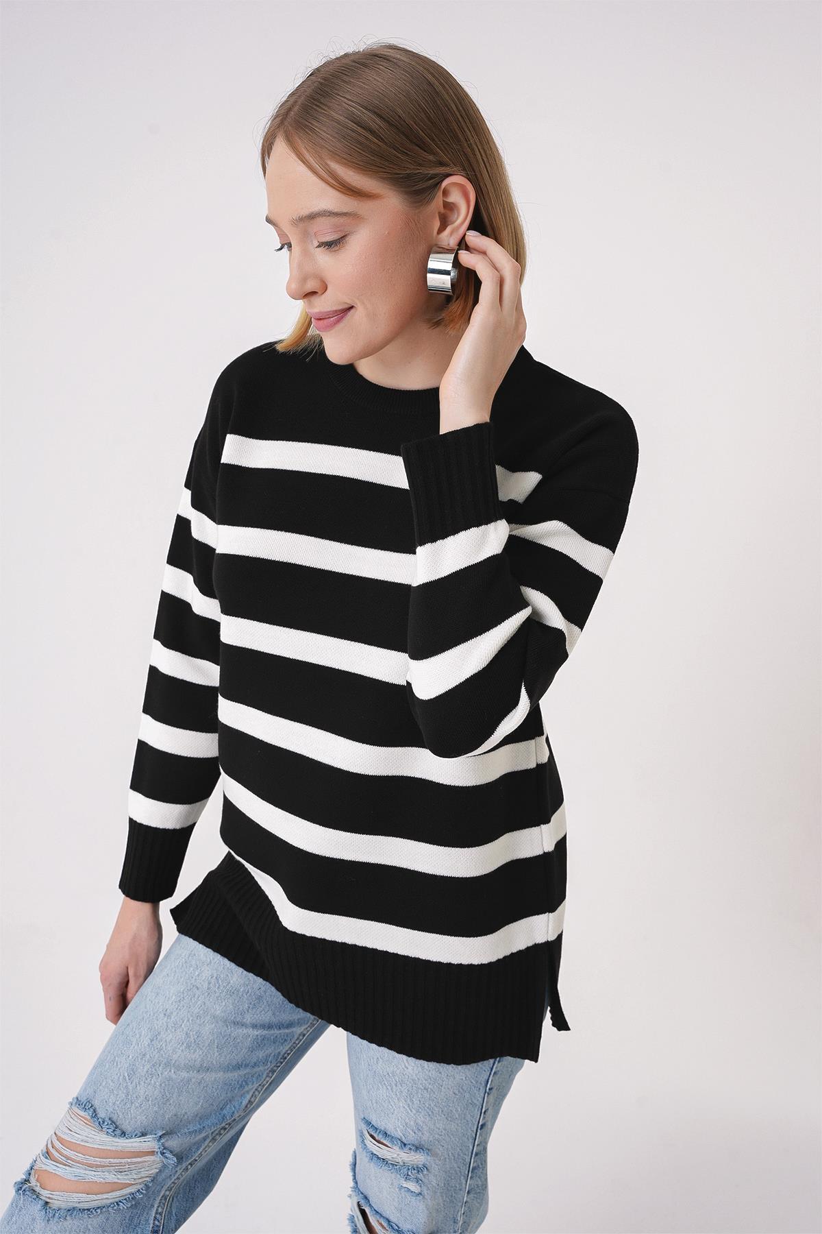 Chuba Kadın Bisiklet Yaka Dokulu Rahat Kalıp Çizgili Triko Kazak Siyah-Beyaz 25W3002