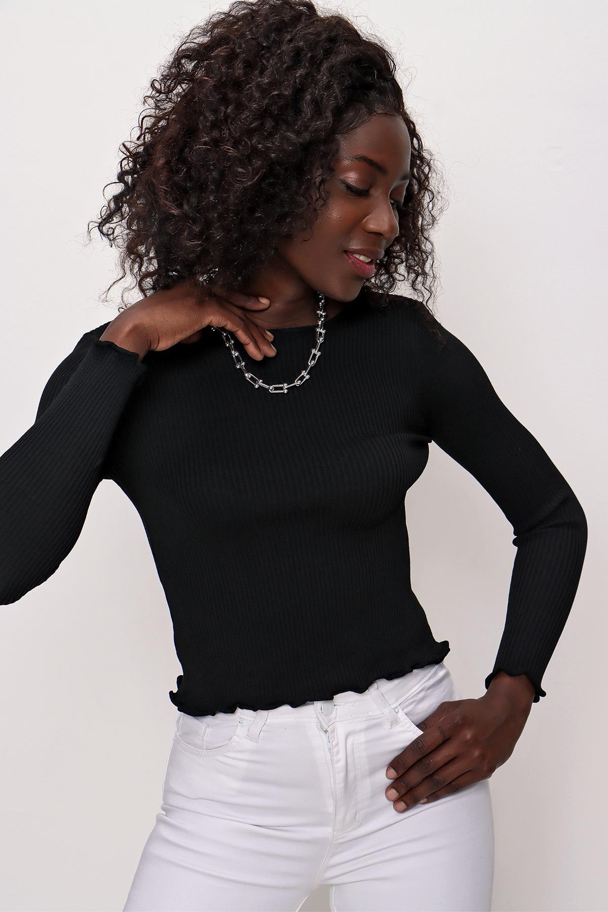 Chuba Kadın Bisiklet Yaka Fırfırlı İnce Triko Kazak Siyah 22SW305