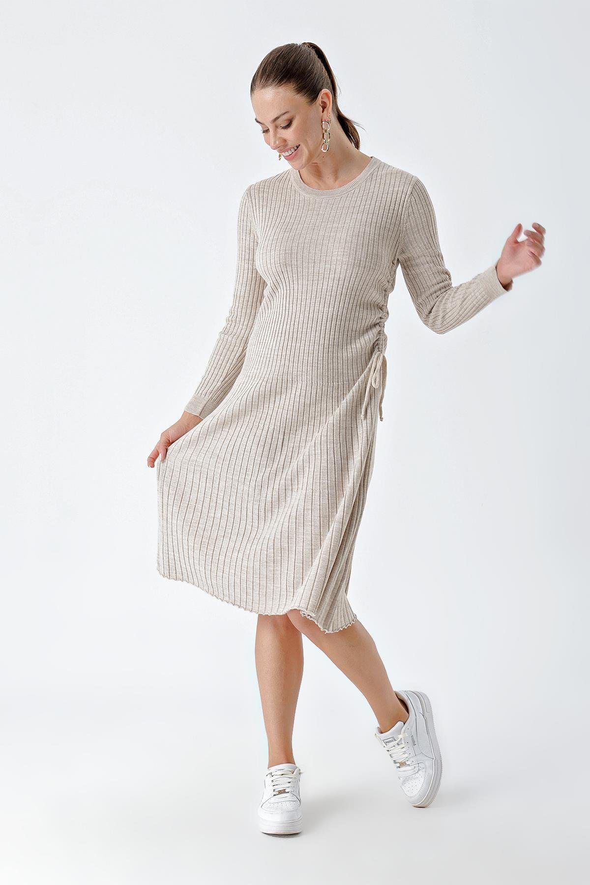 Chuba Kadın Bisiklet Yaka Fitilli Diz Altı Triko Elbise Bej 24W119