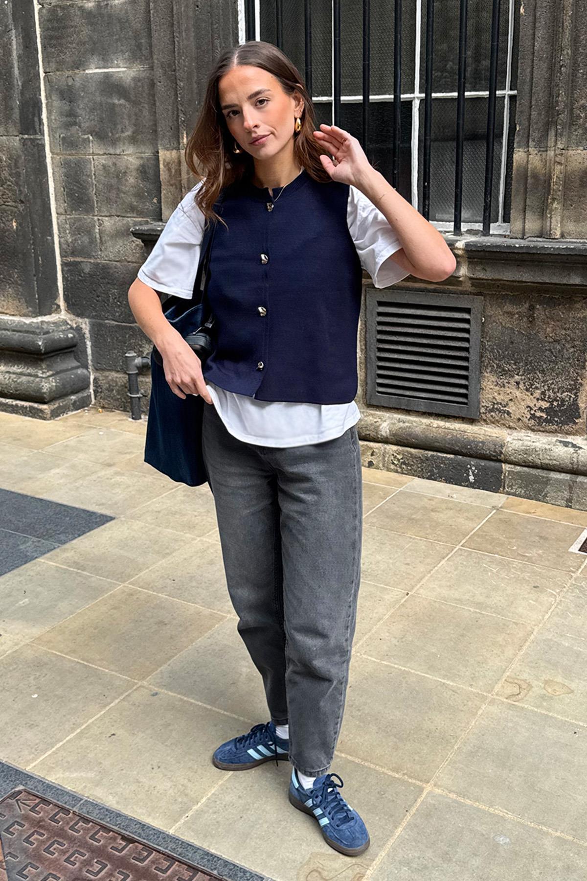 • Regular fit, kolsuz, bisiklet yakalı, gümüş düğme detaylı Chuba triko yelek.