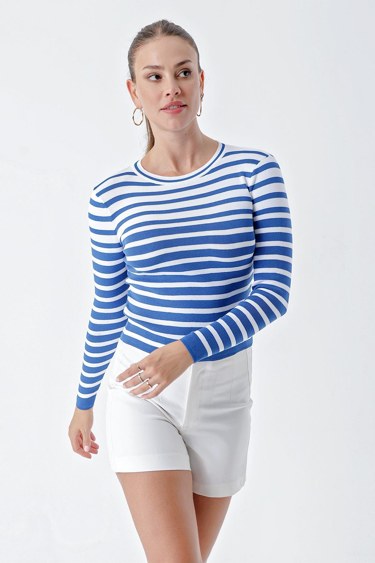 Chuba Kadın Bisiklet Yaka Kontrast Çizgi Detaylı Normal Kalıp Triko Kazak Mavi-Beyaz 24W106