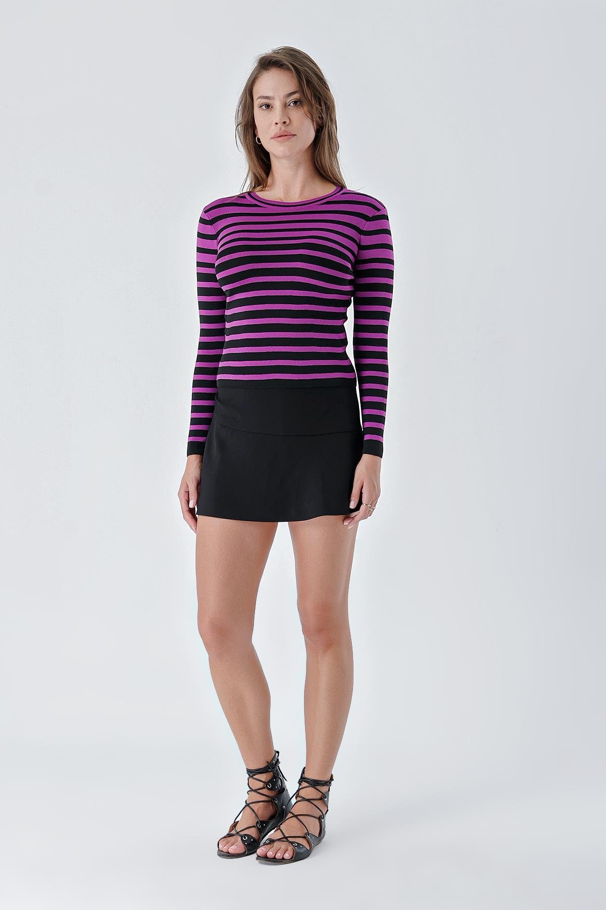 Chuba Kadın Bisiklet Yaka Kontrast Çizgi Detaylı Normal Kalıp Triko Kazak Siyah-Mor 24W106