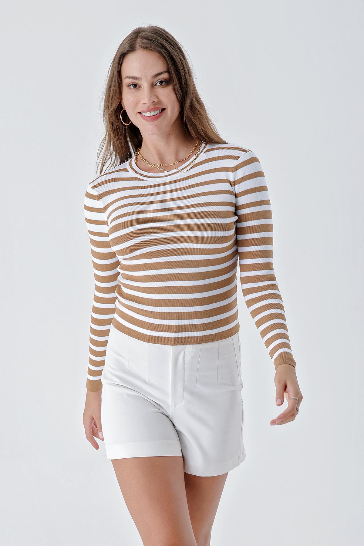 Chuba Kadın Bisiklet Yaka Kontrast Çizgi Detaylı Normal Kalıp Triko Kazak Taba-Beyaz 24W106