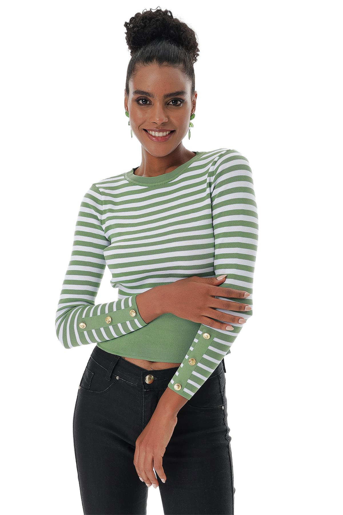 Chuba Kadın Çizgili Bisiklet Yaka Düğme Detaylı Triko Kazak Yeşil-Beyaz 23S1001