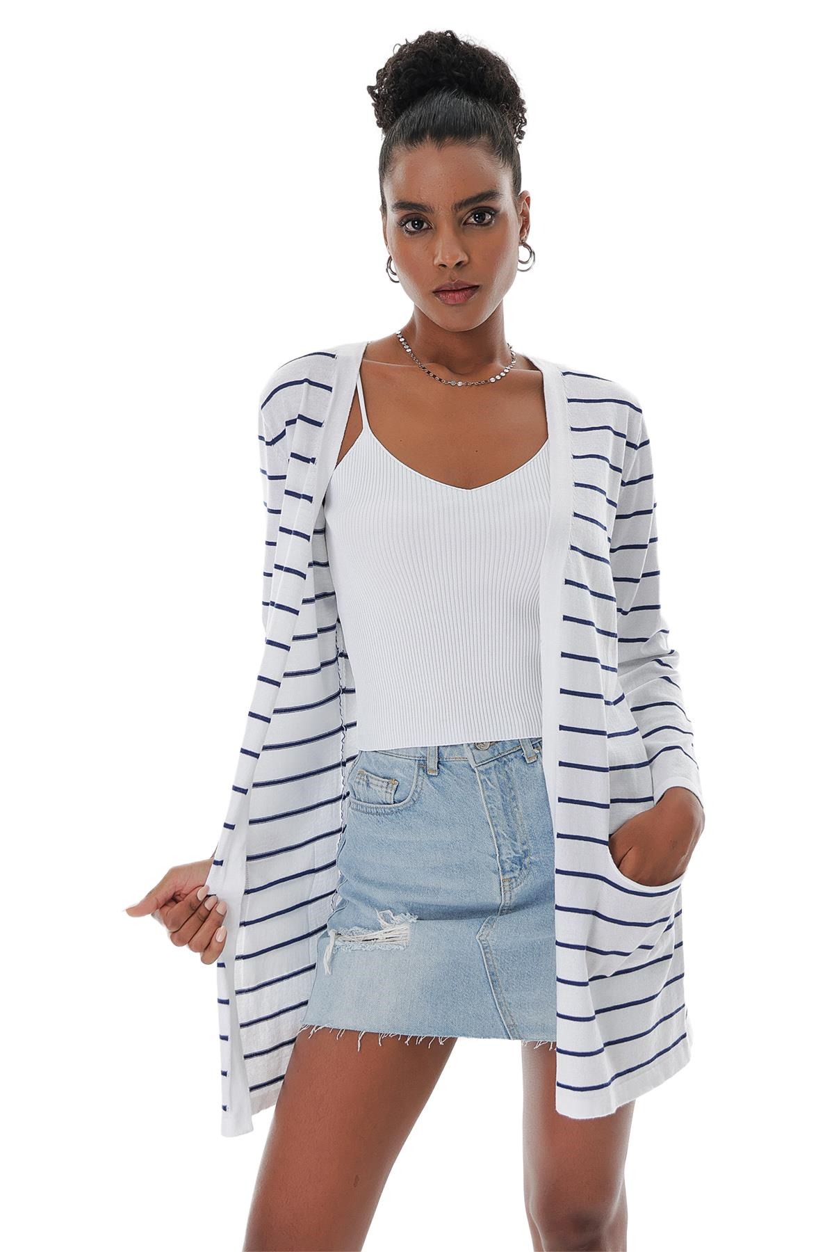 Chuba Kadın Çizgili Cep Detaylı Açık Form Pamuklu İnce Triko Hırka Beyaz 23S1010