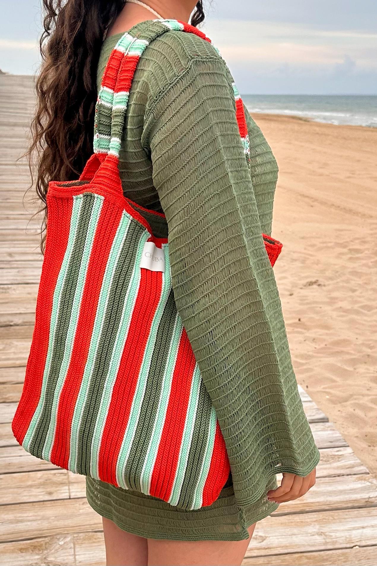 Chuba Kadın Çizgili Çok Renkli İçi Astarlı Triko El&Omuz Plaj Çantası Turuncu-Yeşil CHAX816