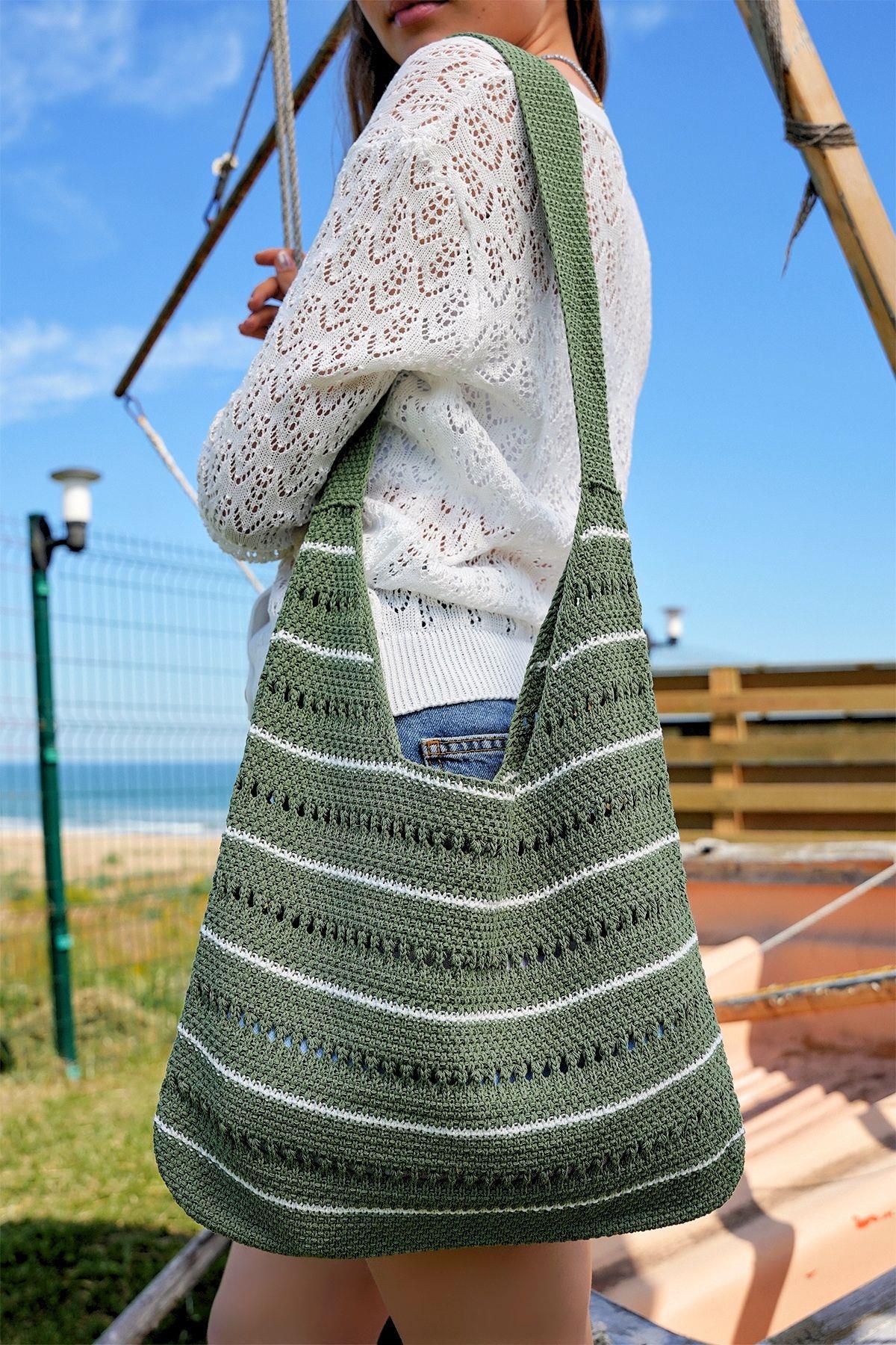 Chuba Kadın Çizgili Triko Örgü Çapraz Askılı Gündelik El&Omuz Ve Plaj Çantası Yeşil Beyaz CHAX804