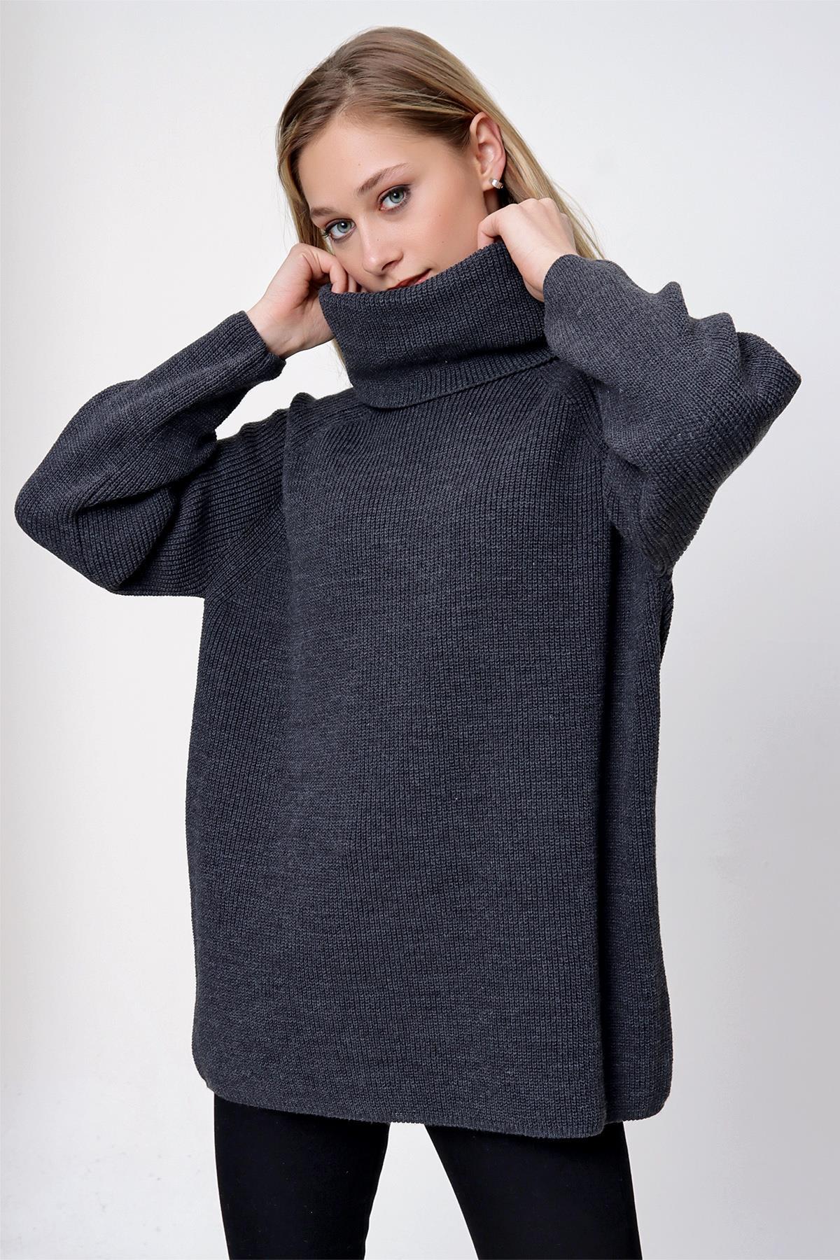 Chuba Kadın Degaje Yaka Uzun Selanik Triko Kazak Antrasit 22WK258