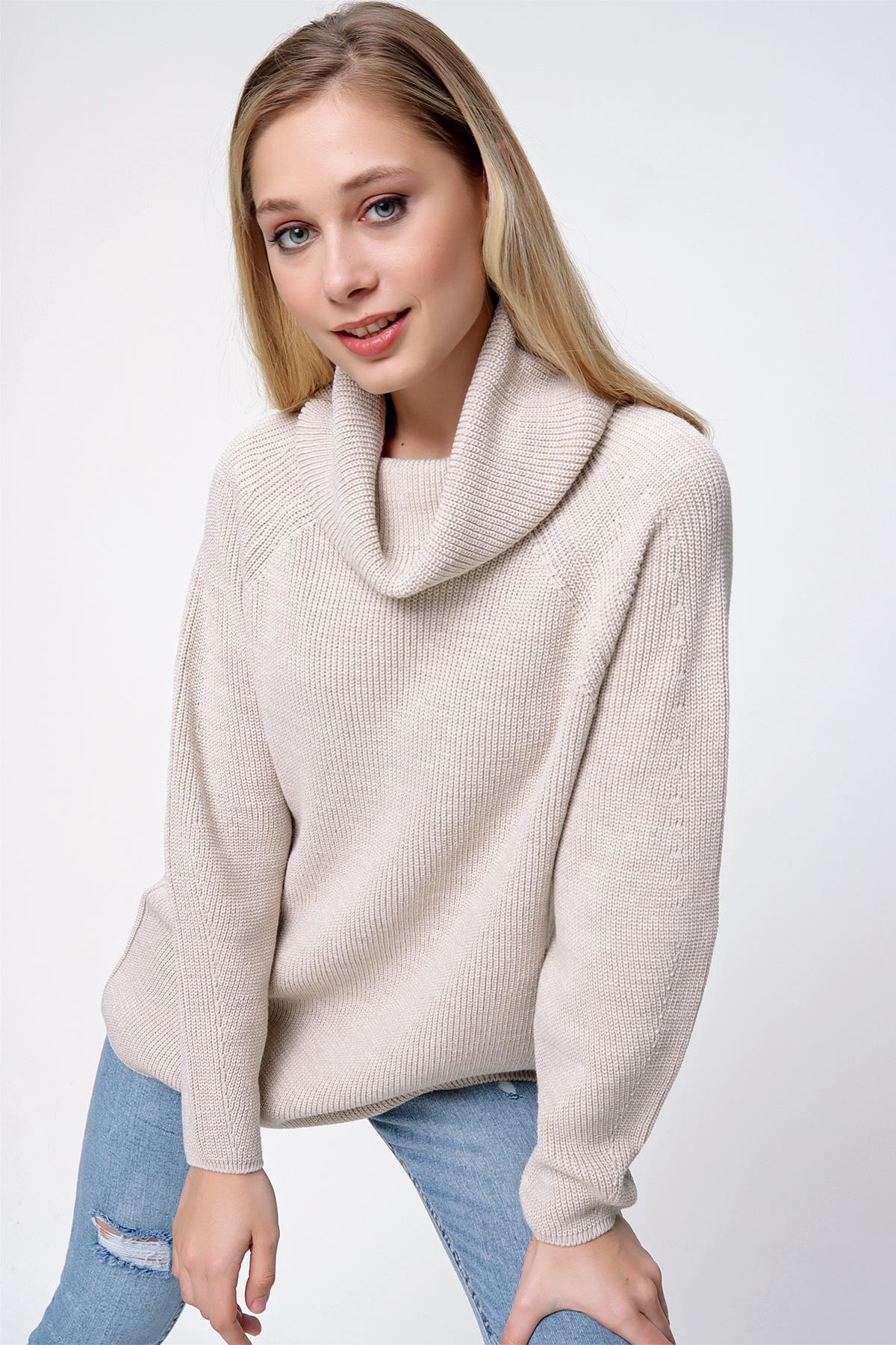 Chuba Kadın Degaje Yaka Uzun Selanik Triko Kazak Bej 22WK258