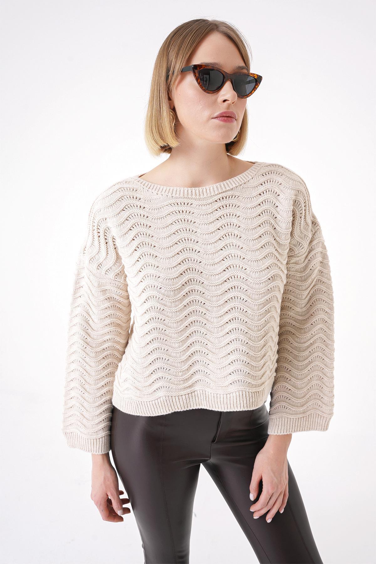 • İspanyol kol, dalga desenli, rahat kalıp triko kazak