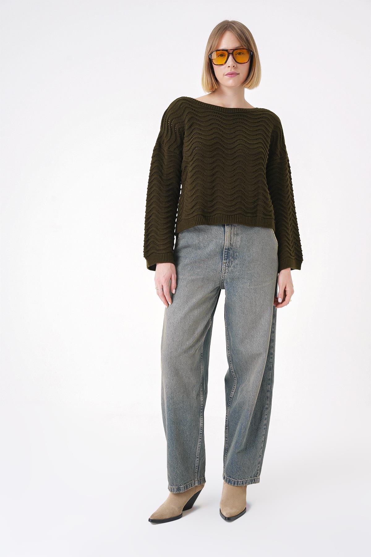 • İspanyol kol, dalga desenli, rahat kalıp triko kazak