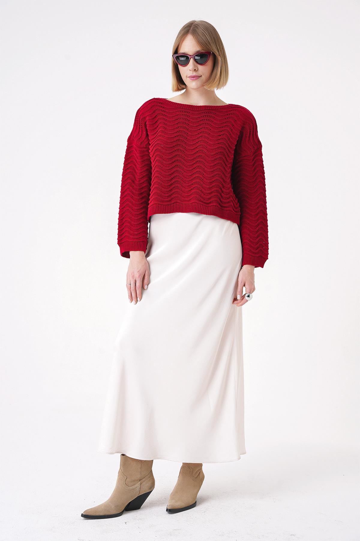 Chuba Kadın Desenli İspanyol Kol Rahat Kalıp Bisiklet Yaka Triko Kazak Kırmızı 25W3006