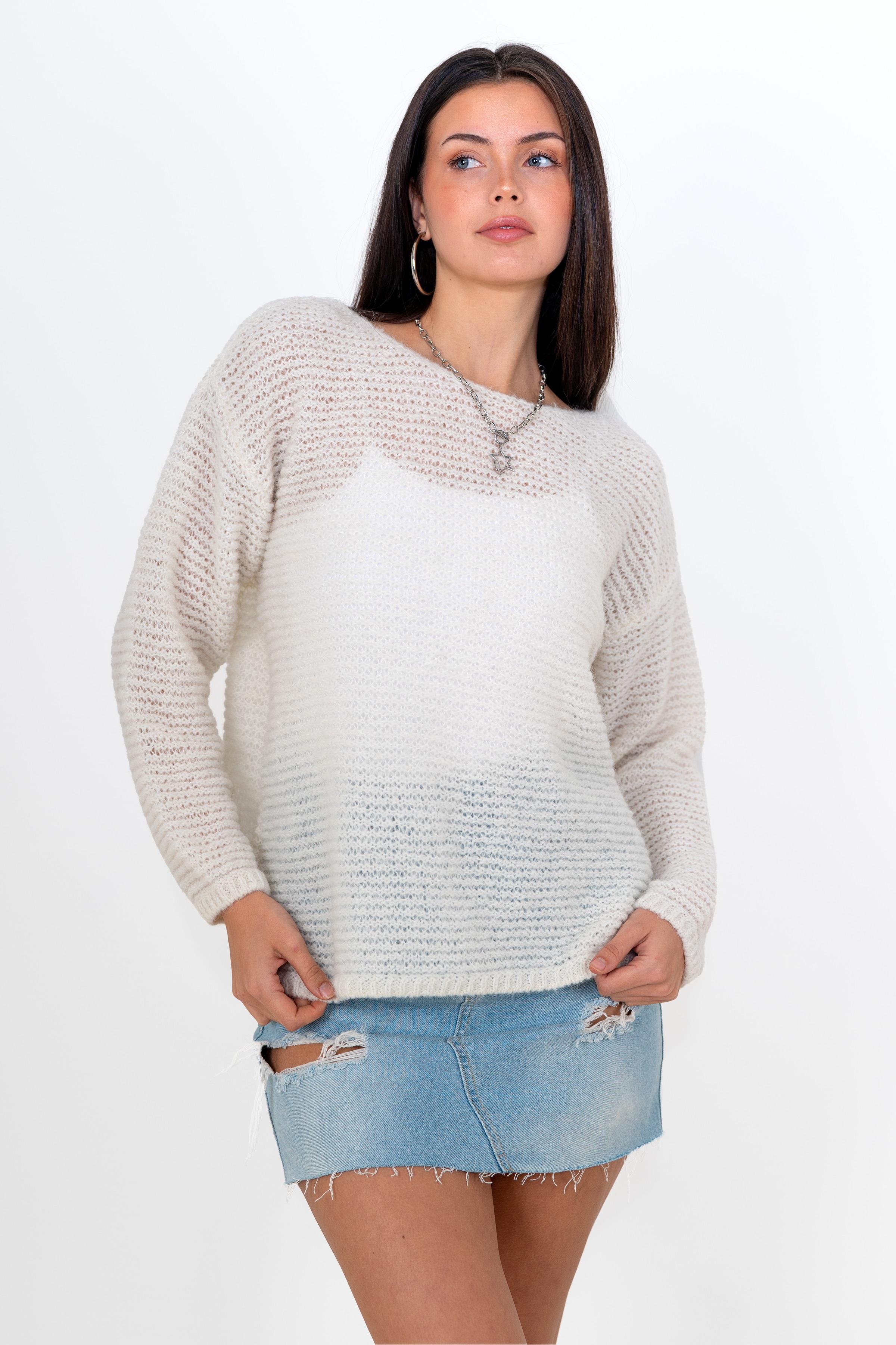 Chuba Kadın Dokulu Yumuşak Tuşe Alpaka Yün Kayık Yaka Triko Kazak Ekru 24W143