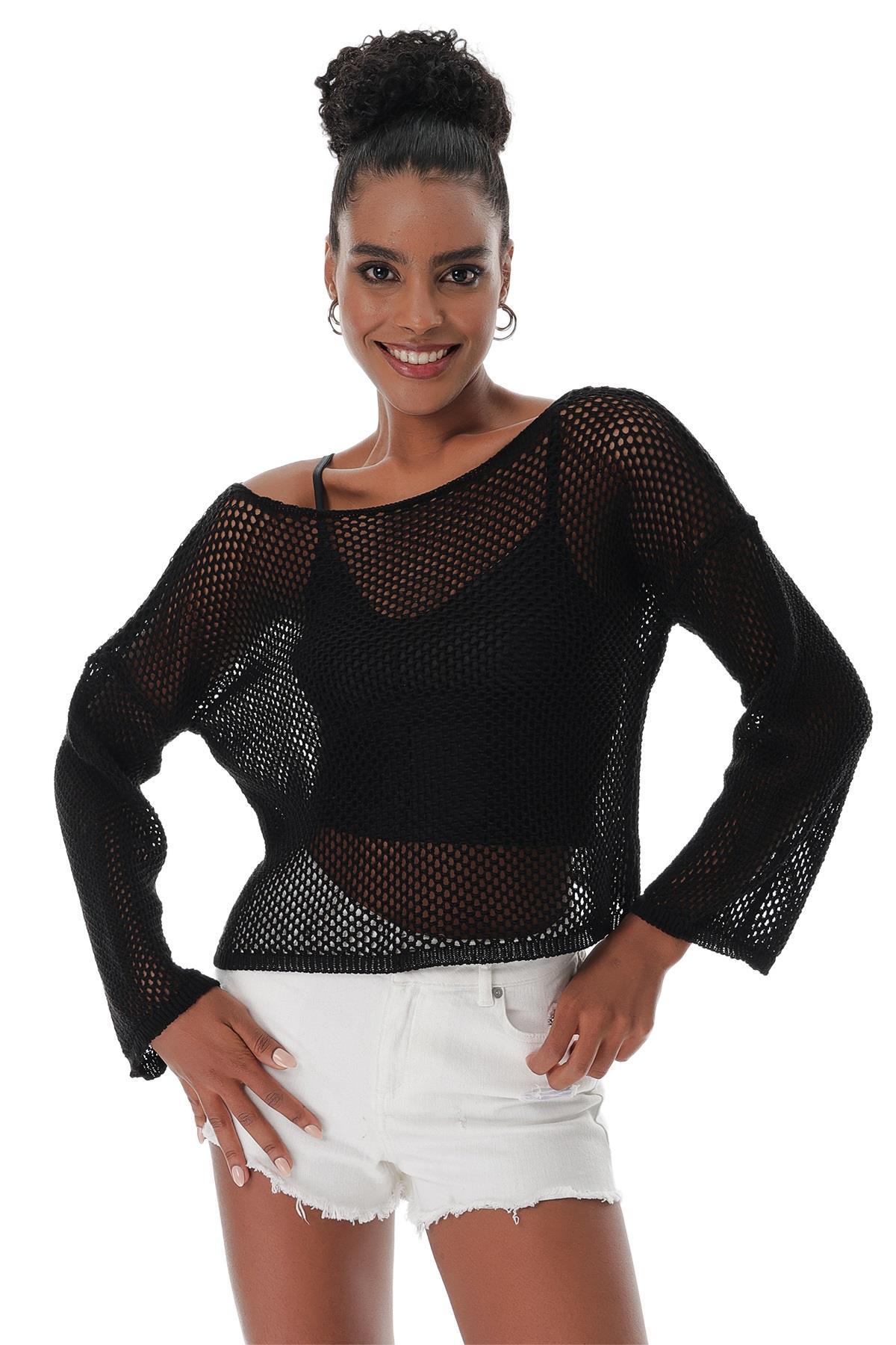 Chuba Kadın File Örgü Pamuklu Bolero Triko Kazak Siyah 23S1006