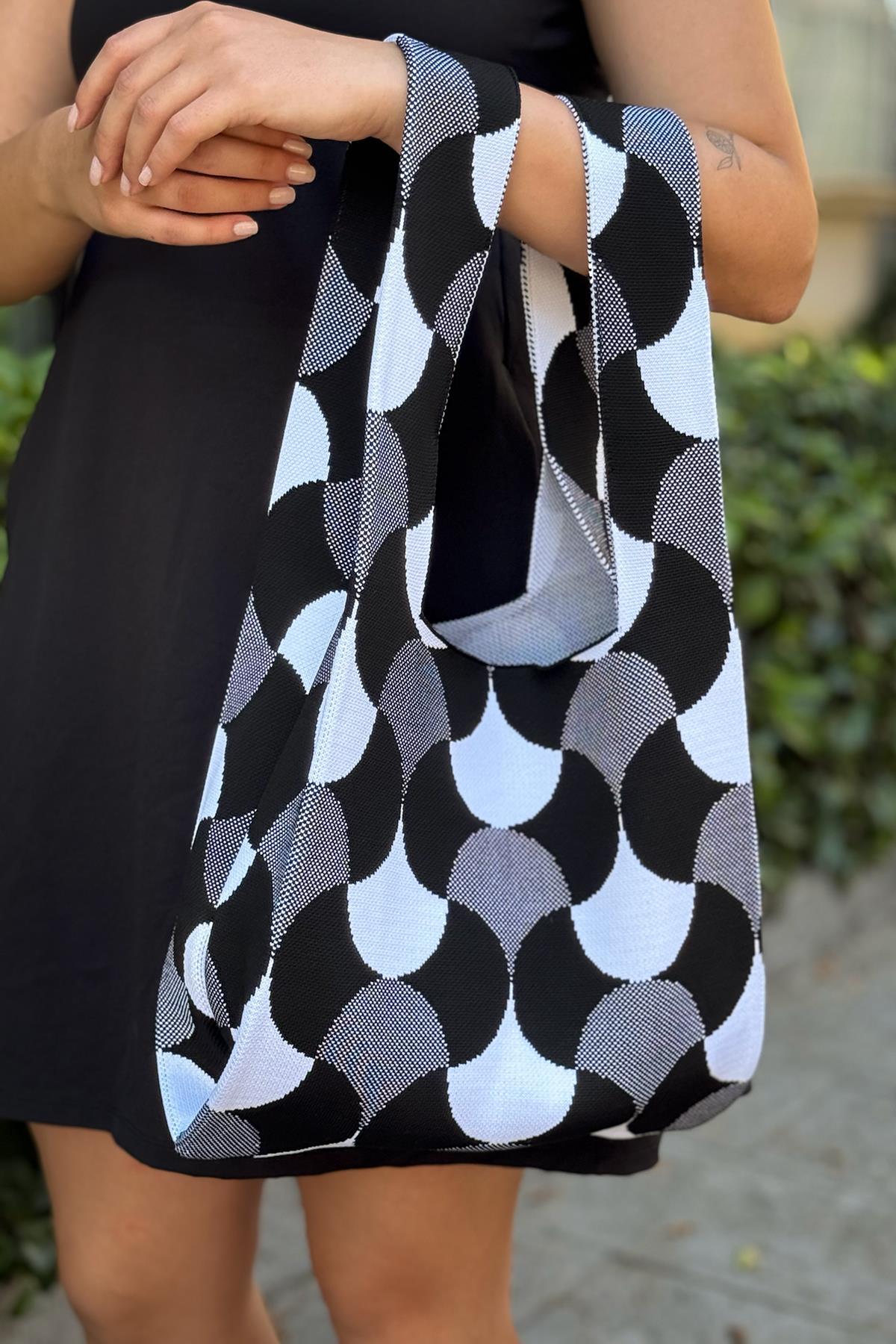 Chuba Kadın Geometrik Desenli Torba Triko El & Omuz Tote Çanta Siyah CHAX818