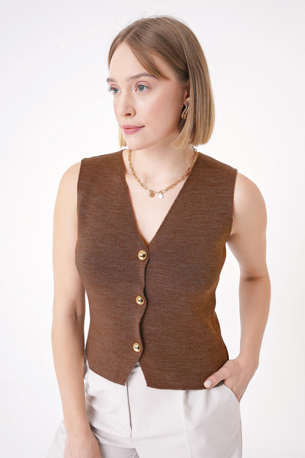 Chuba Kadın Gold Düğmeli Dokulu Regular Fit Triko Yelek Kahverengi 25W3001