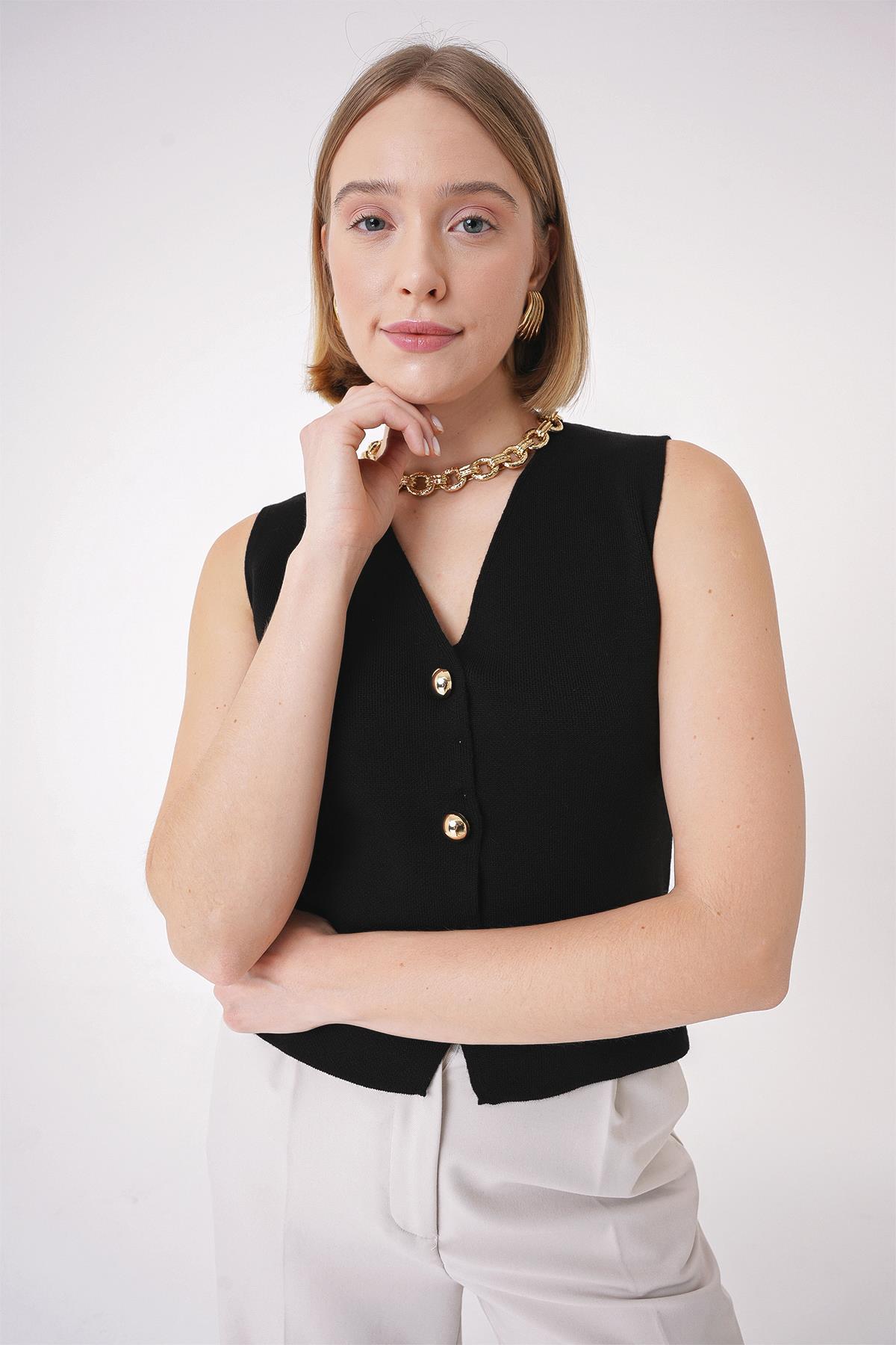 Chuba Kadın Gold Düğmeli Dokulu Regular Fit Triko Yelek Siyah 25W3001