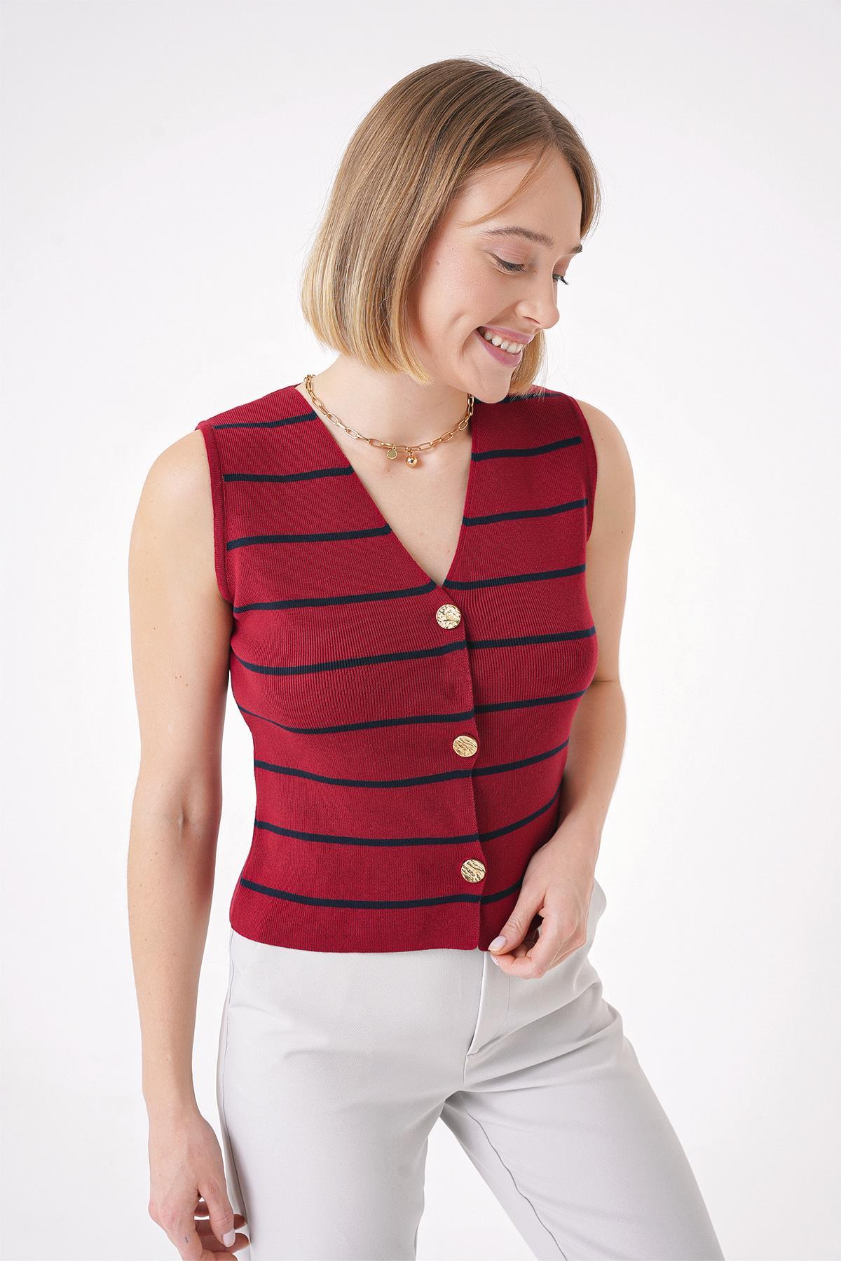 Chuba Kadın Gold Düğmeli Standart Fit Çizgili Dokulu Triko Yelek Kırmızı-Lacivert 25W3010