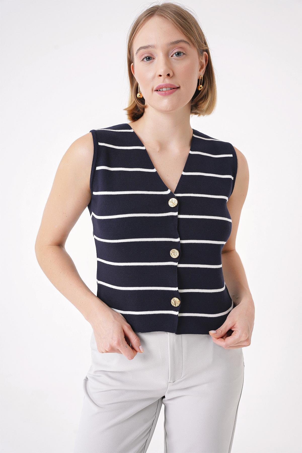 Chuba Kadın Gold Düğmeli Standart Fit Çizgili Dokulu Triko Yelek Lacivert-Beyaz 25W3010