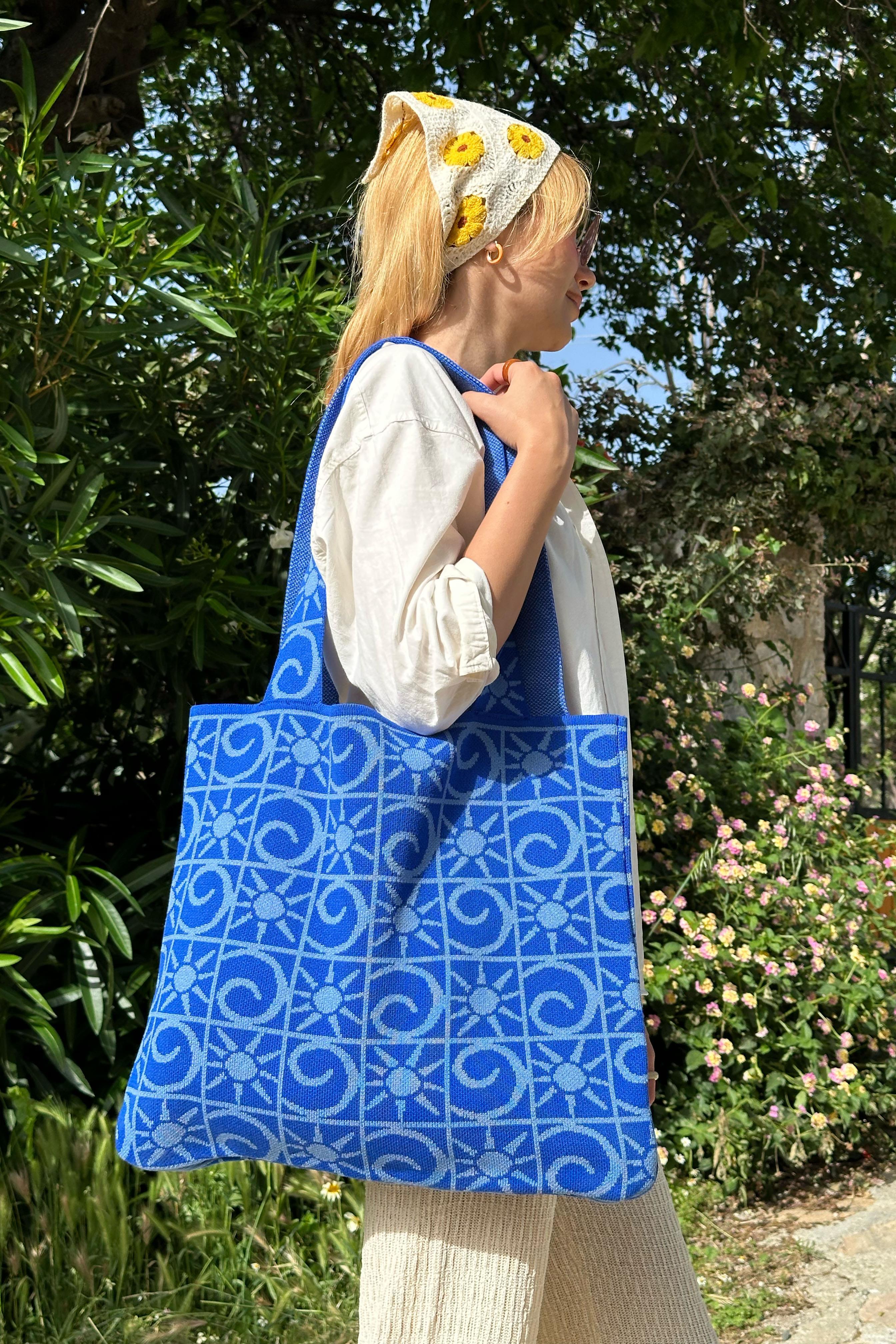 Chuba Kadın Güneş Jakar Desenli Triko El&Omuz Plaj Çantası Saks-Indigo CHAX815