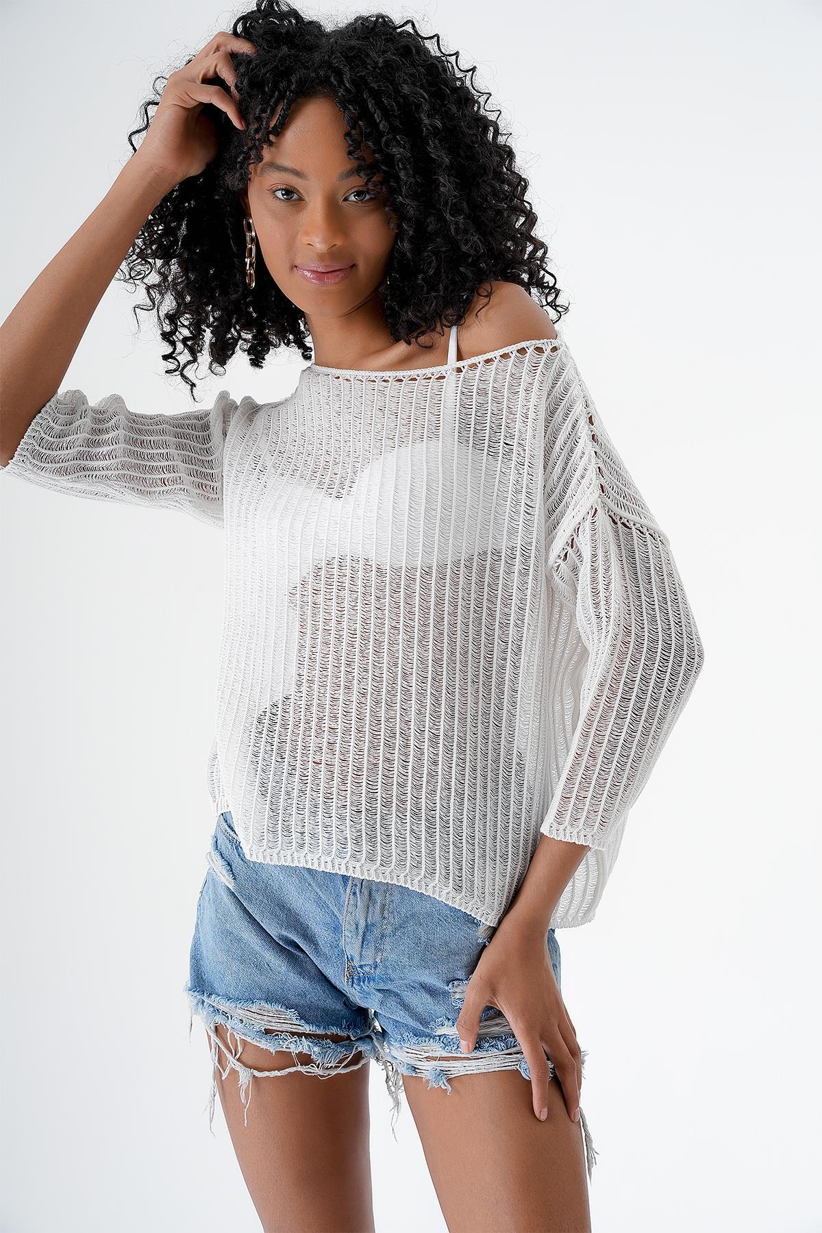 Chuba Kadın Kayık Yaka Ajurlu Transparan Triko Kazak Beyaz 24S159