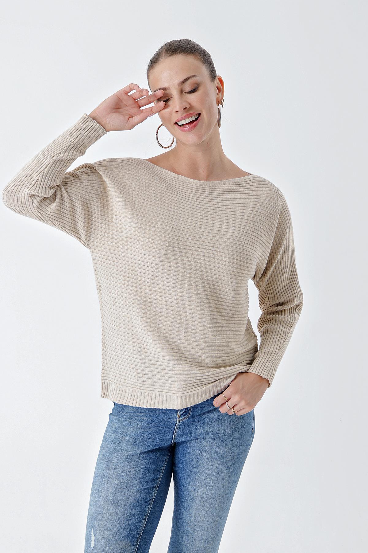 Chuba Kadın Kayık Yaka Fitilli Salaş Triko Kazak Bej 24W109