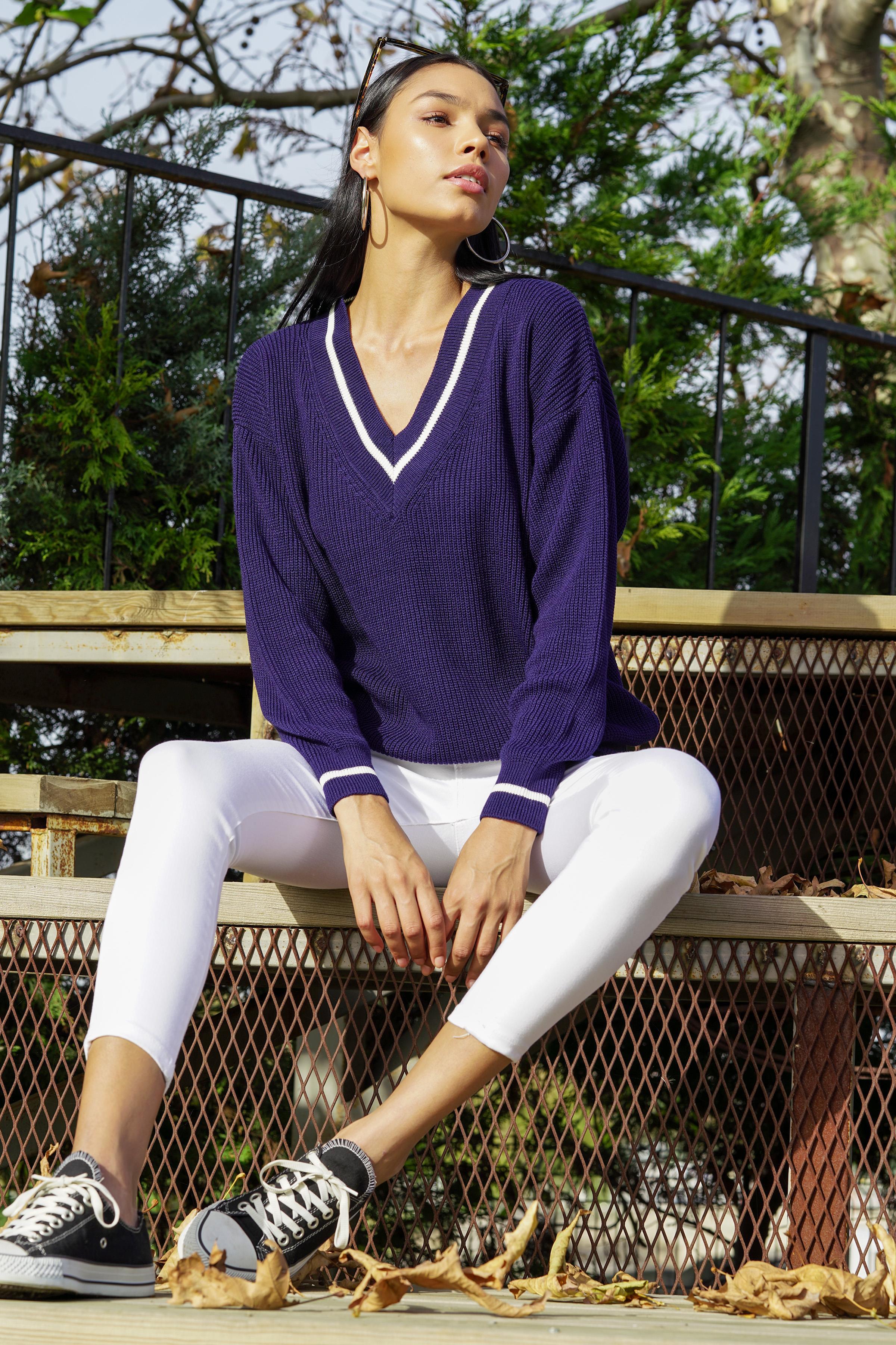 Chuba Kadın Lacivert V Yaka Kontrast Çizgi Detaylı Rahat Kalıp Selanik Triko Kazak 22WK209