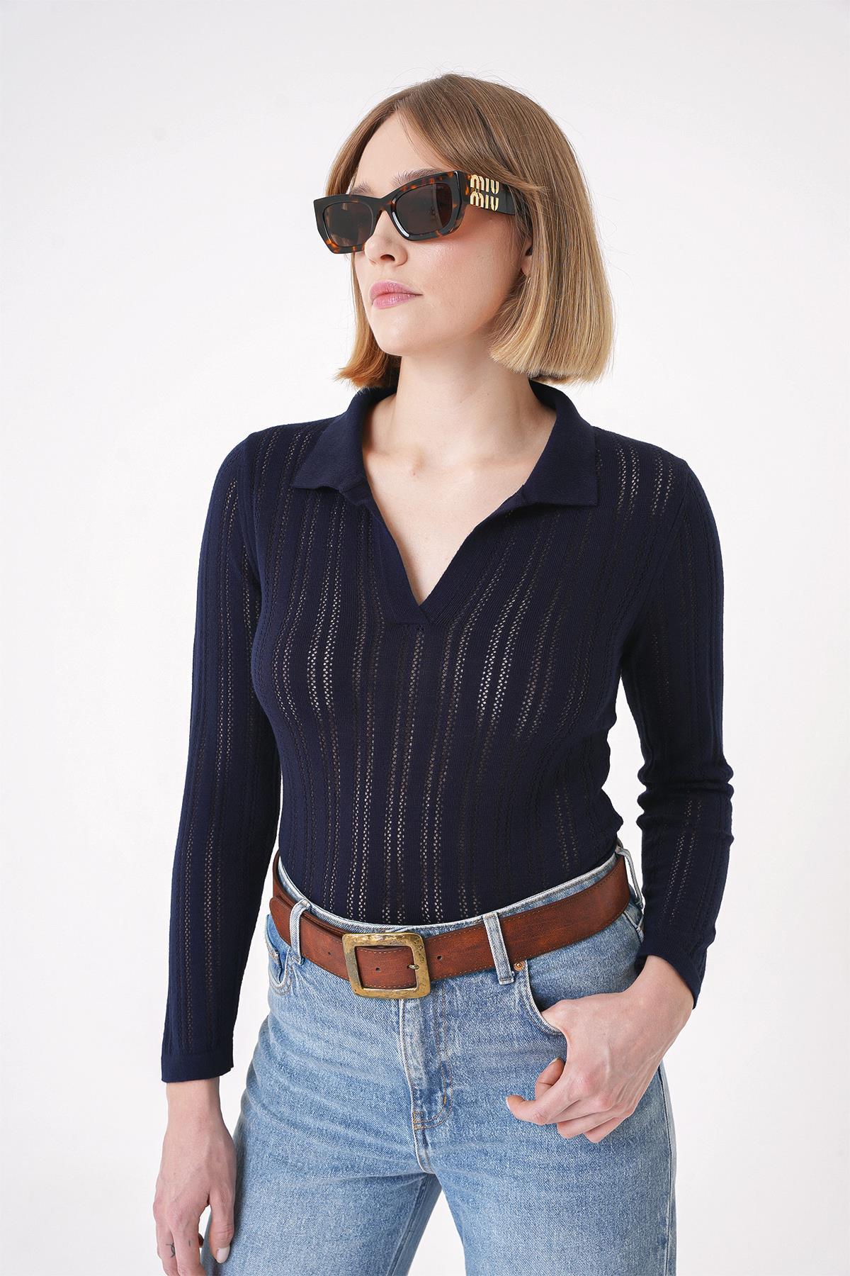 • Polo yaka, uzun kollu, ajur desenli, Chuba polo yaka triko kazak.