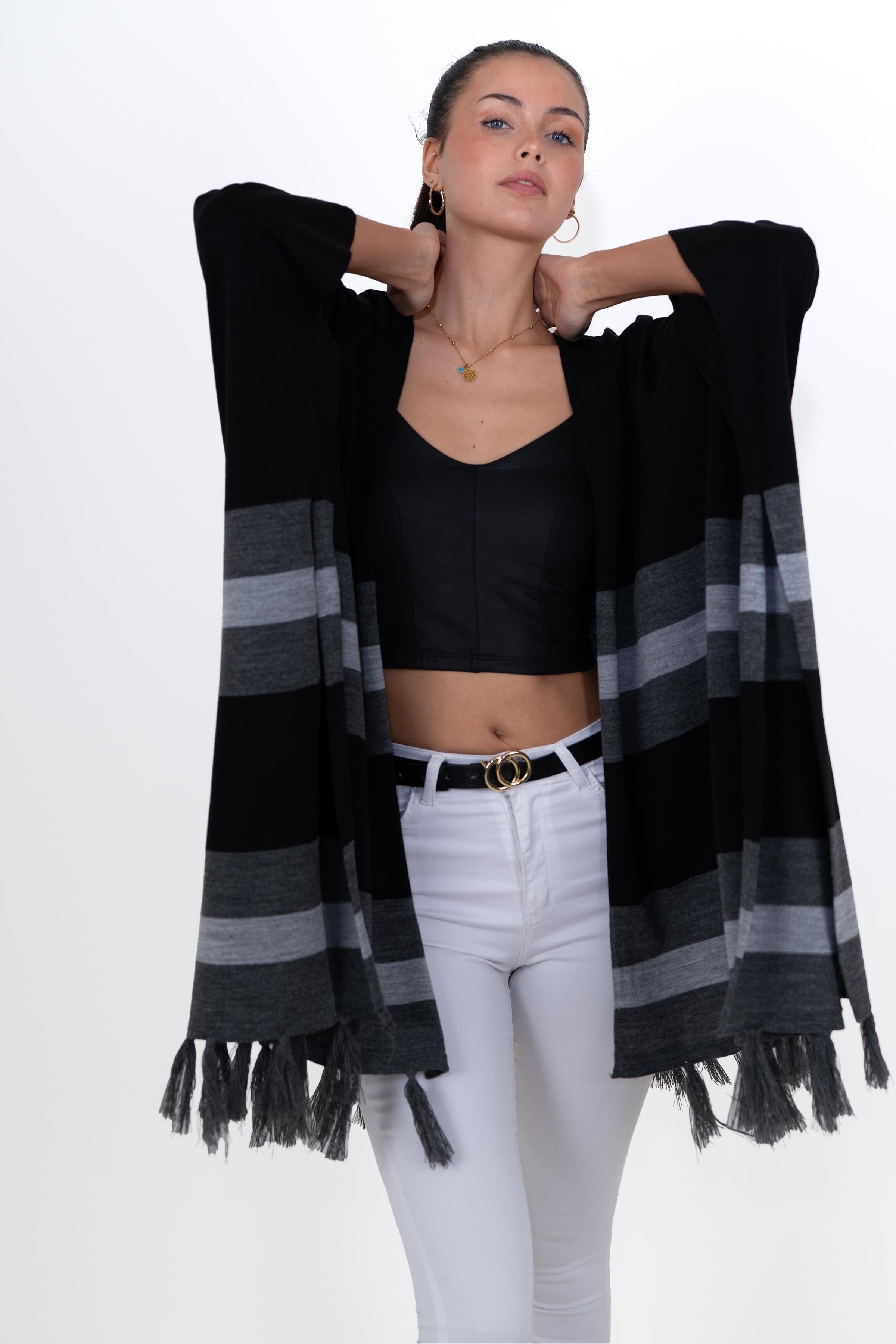 Chuba Kadın Püsküllü Renk Bloklu Triko Panço Şal Siyah 24W123