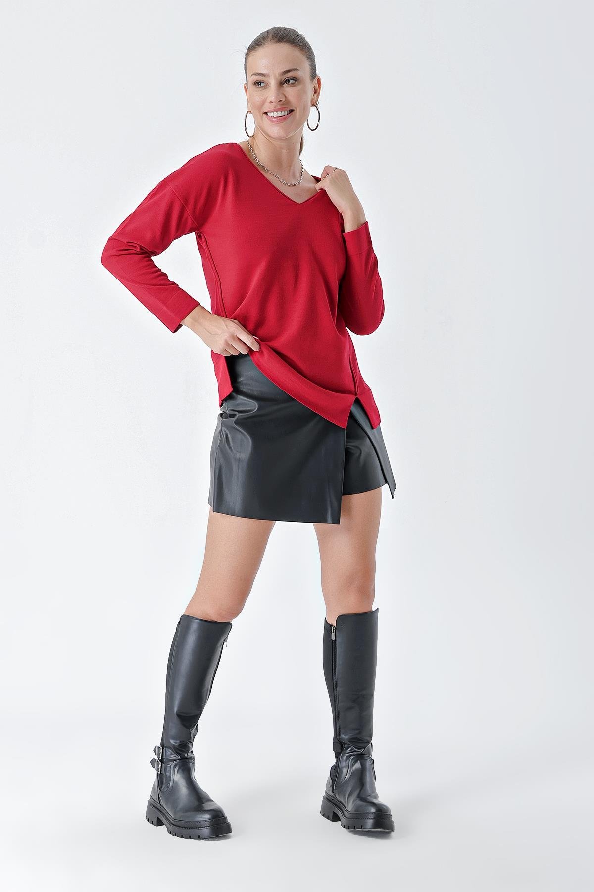 Chuba Kadın Rahat Kalıp Verev Dikiş Detaylı V Yaka Triko Kazak Kırmızı 24W117