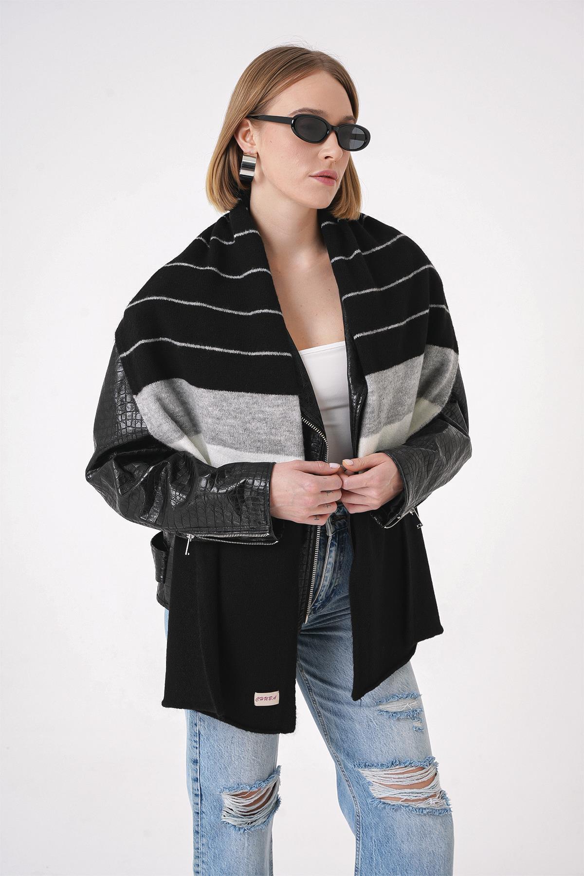 Chuba Kadın Renk Bloklu Yumuşak Dokulu Atkı Şal Siyah 25W5002