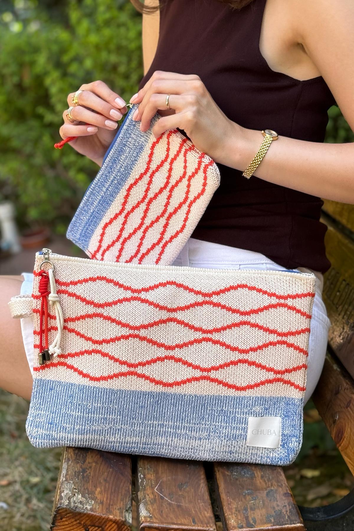 • Üç Renkli dalga desenli, renkli fermuarlı, sap detaylı, paracord ip aksesuarlı Chuba Logo Etiketli Triko Laptop-Tablet Kılıfı ve El-Seyahat Çantası Takımı.
