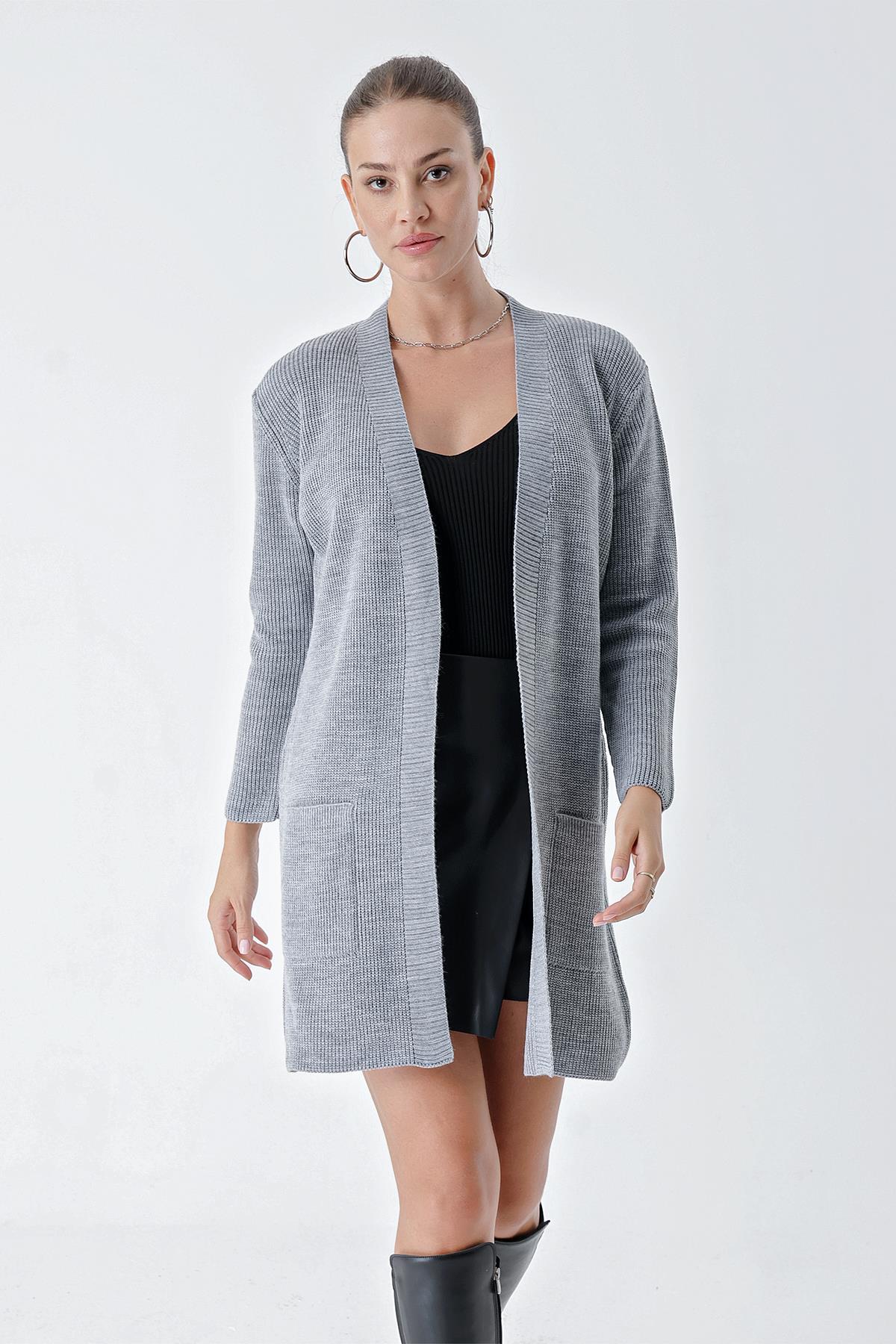 Chuba Kadın Selanik Örgü Cepli Triko Hırka Gri 24W110