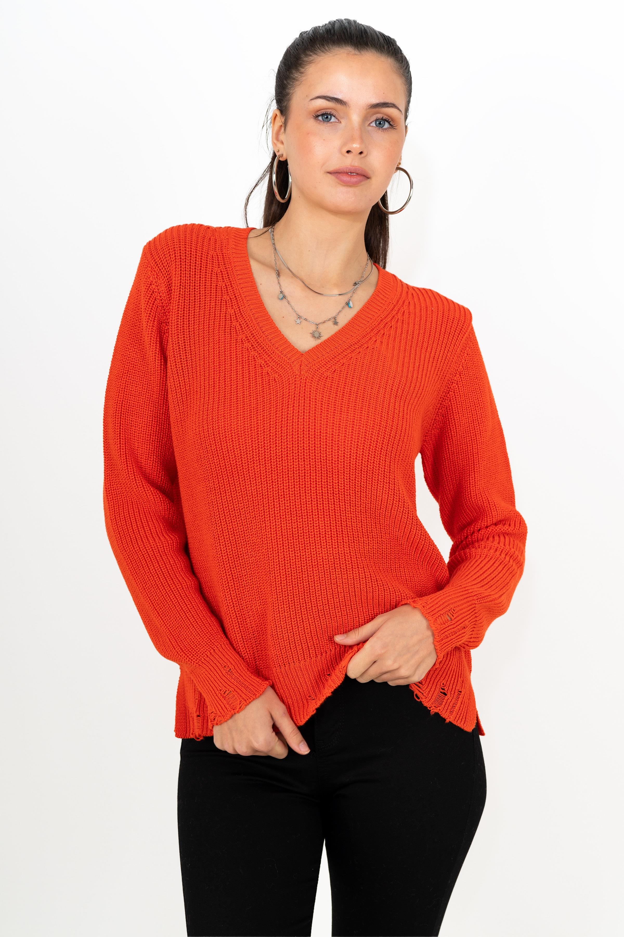 Chuba Kadın Selanik Örgü Pamuklu V Yaka Triko Kazak Nar Çiçeği 24W144