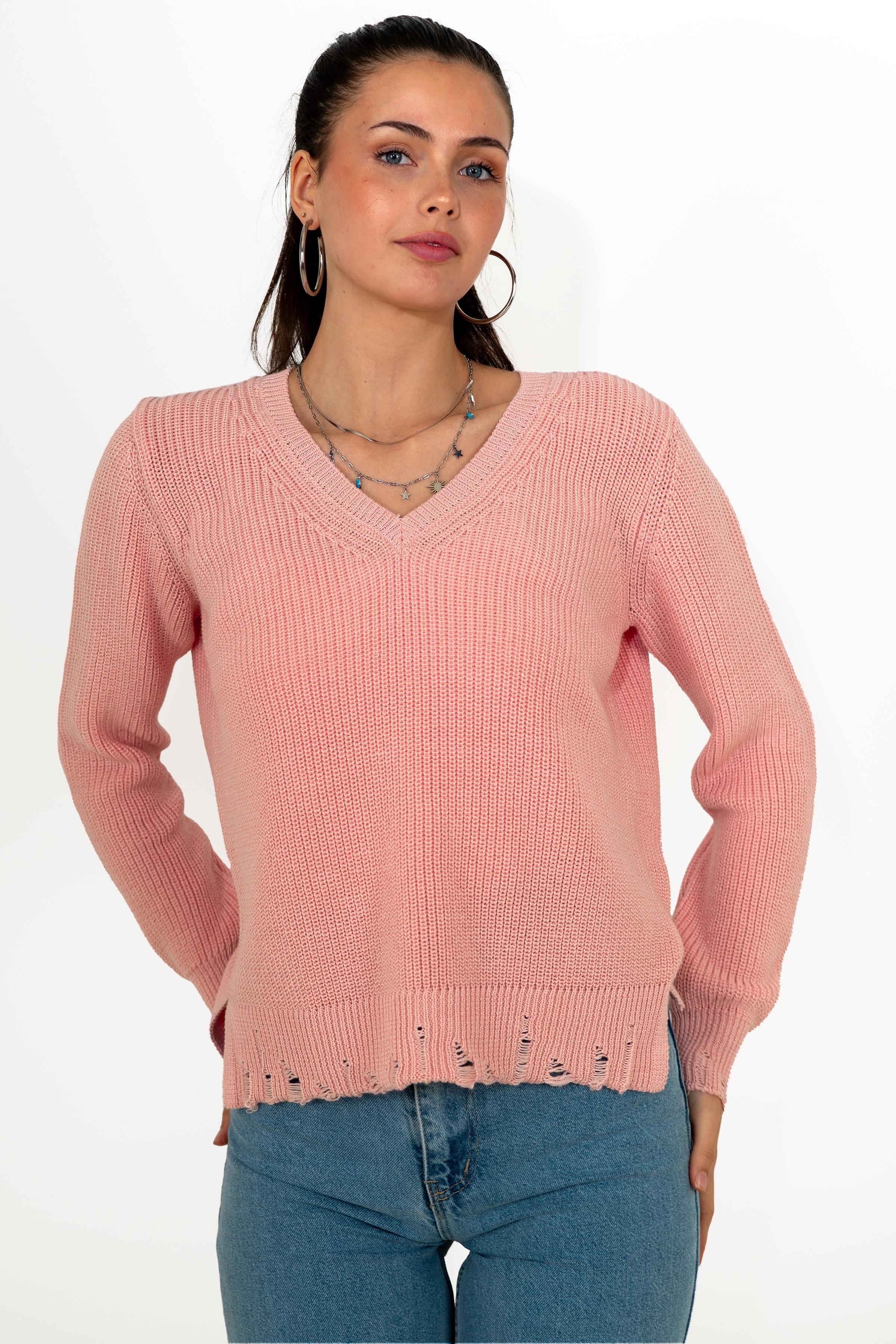 Chuba Kadın Selanik Örgü Pamuklu V Yaka Triko Kazak Pudra 24W144