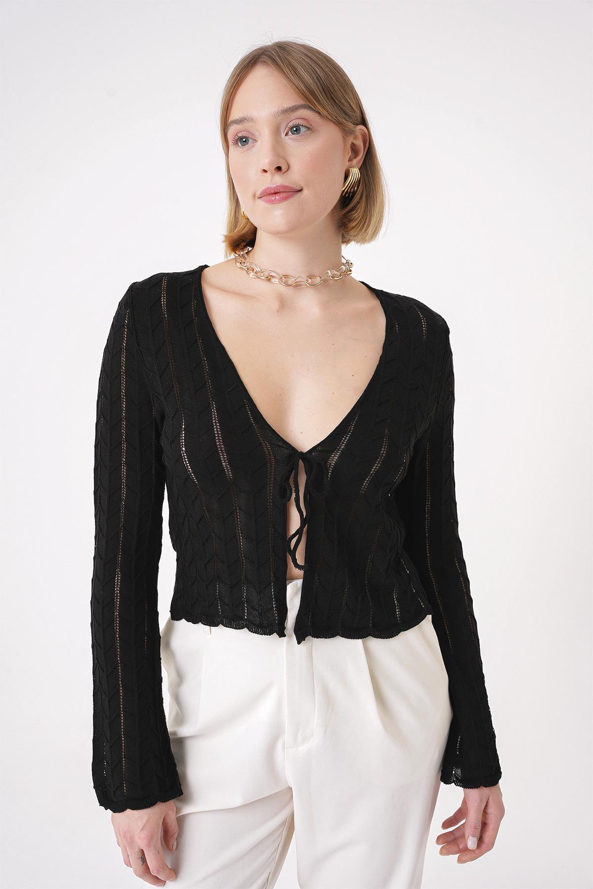 Chuba Kadın V Yaka Ajur Desenli Önde İp Bağlamalı Standart Fit Triko Hırka Siyah 25W3008