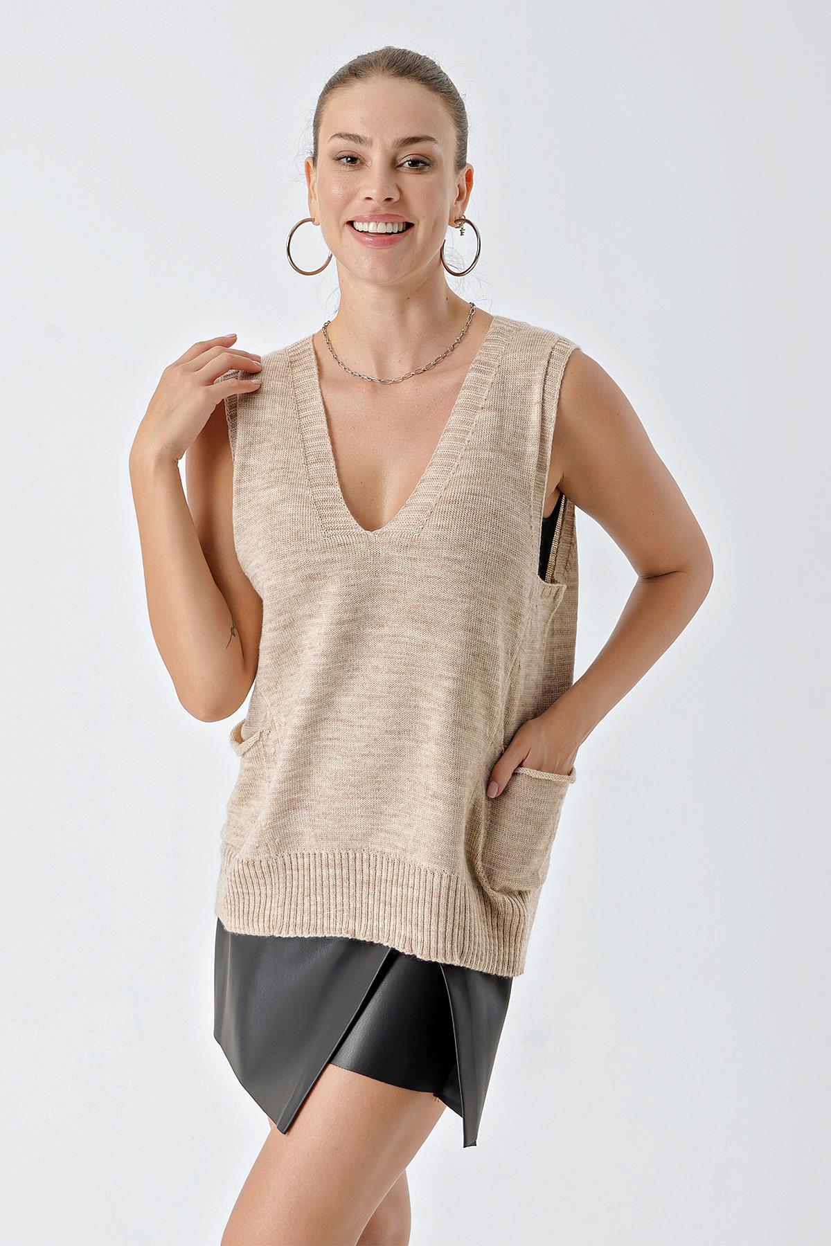 Chuba Kadın V Yaka Rahat Kalıp Çift Cep Asimetrik Dikiş Detaylı Triko Süveter Bej 24W118